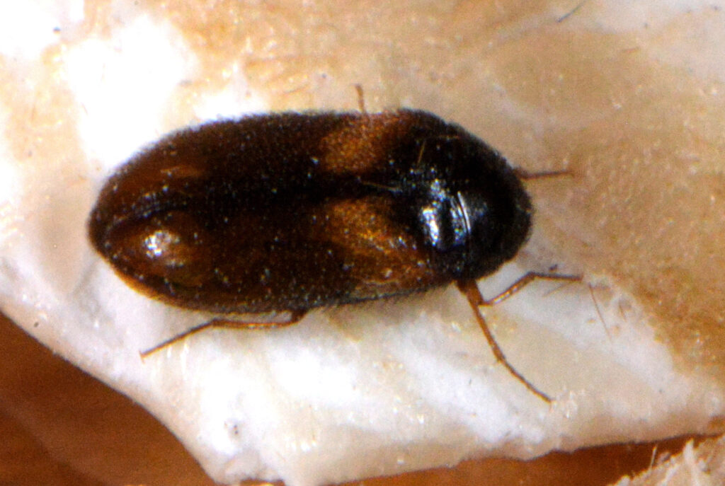 Aussehen Der Käfer ist 2-5 mm lang. Die Körperform ist langoval, hinter der Mitte leicht verbreitert. Der Kopf ist schwarz und schwarz behaart, auf der Stirn trägt er ein Punktauge. Die Antennen sind 11-gliedrig, dabei bilden die letzen 4 Glieder eine lockere schwarze Keule. Halsschild und Flügeldeckenbasis sind schwarz. Über den Flügeldecken haben die Käfer ein gelbliches Band von Haaren. Die bis zu 6mm langen Larven mit einem Haarbüscheln am Ende ähneln sehr denen von Anthrenus, Attagenus oder Trogoderma (T. angustum und T. granarium)