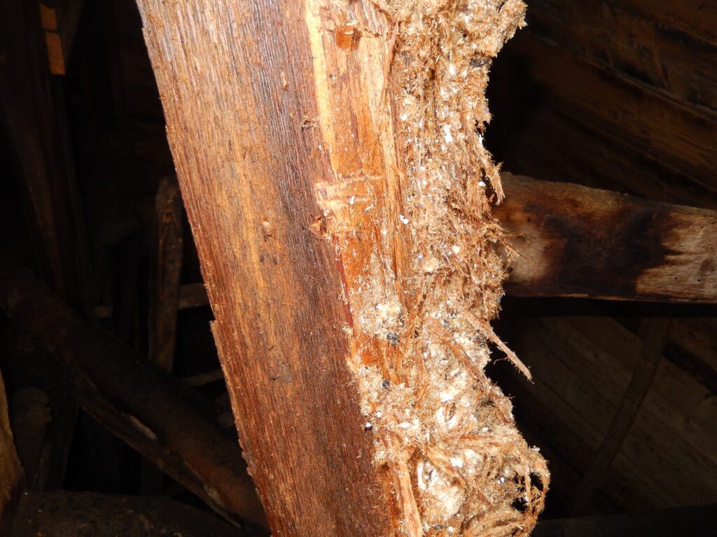 An Dachlatten und Sparren von älteren Ziegeldächern kann man immer wieder Mazerations-Erscheinungen mit zerfaserten Oberflächen entdecken, wo der Einfluss von Salzen oder Salzlösungen (z.B. Magnesiumsulfat aus Dachziegeln) oder Umweltschadstoffe eine Rolle spielen können.