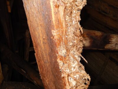 An Dachlatten und Sparren von älteren Ziegeldächern kann man immer wieder Mazerations-Erscheinungen mit zerfaserten Oberflächen entdecken, wo der Einfluss von Salzen oder Salzlösungen (z.B. Magnesiumsulfat aus Dachziegeln) oder Umweltschadstoffe eine Rolle spielen können.
